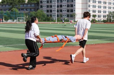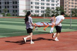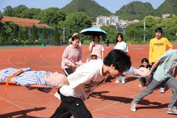 担架接力4×100项目中,同学们两人一组,默契配合,抬着模拟伤病员在赛道上全力冲刺。尽管模拟伤病员增加了搬运的难度,但各参赛队伍凭借着出色的团队协作和速度,勇往直前,向着终点飞奔而去,充分展现了在紧急救援中争分夺秒、团结协作的精神。