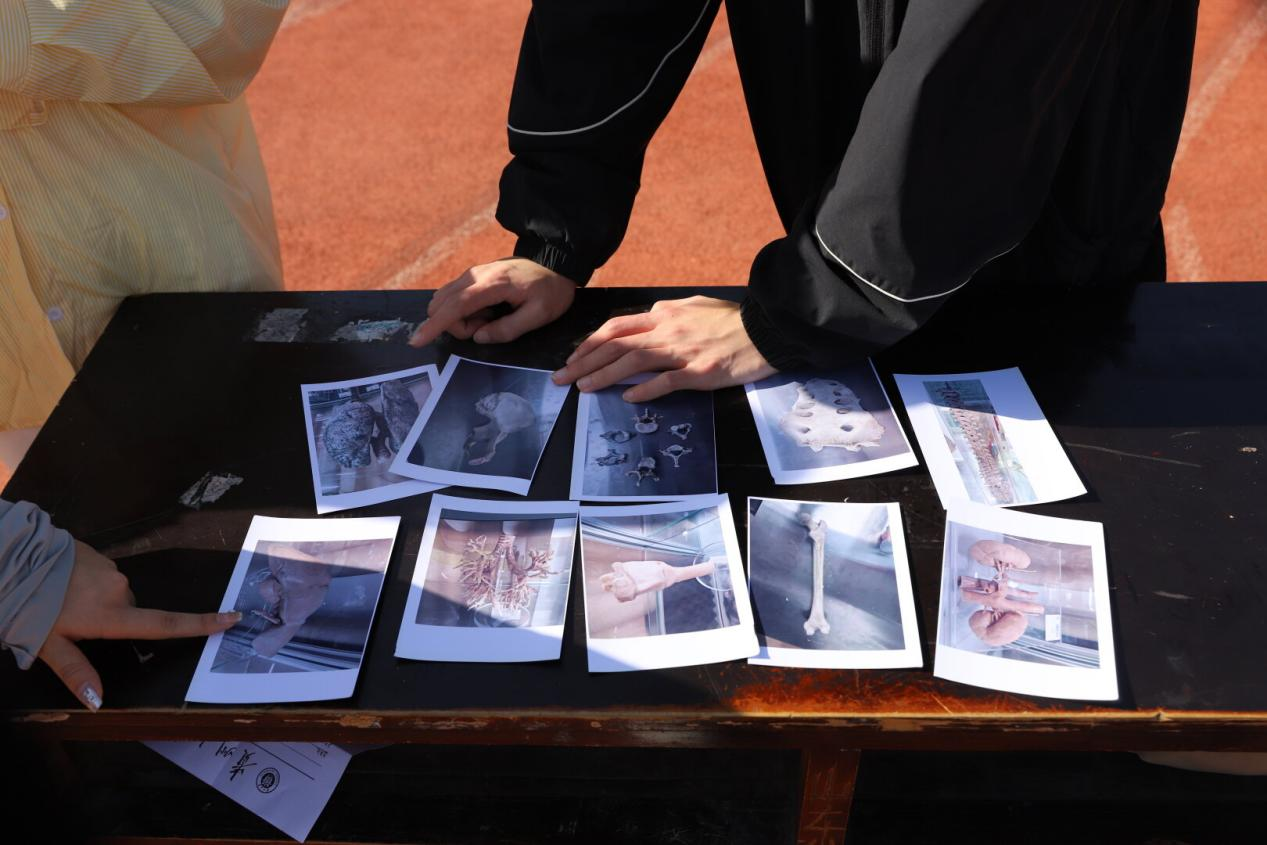 医学标本辨认接力则是一场知识与速度的较量。每个接力点摆放骨骼模型、器官标本的照片,参赛队员们完成跑步后需迅速辨认并填写答案方可完成接力,同学们在奔跑中巩固了专业知识,将学习与运动巧妙融合。