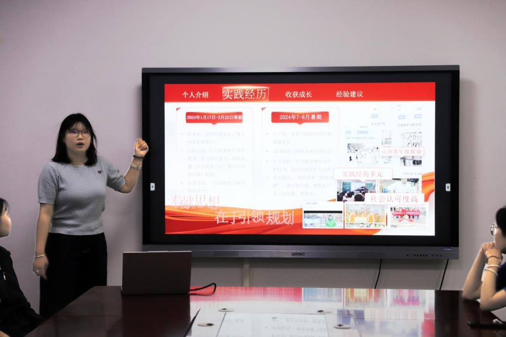 随后,社会实践单项奖学金获得者侯乐华分享了黄河滩生态守护的环保实践,以及作为志愿者通过抖音直播为家乡农产品代言的助农故事。同时,她现场演示了“创青春”公众号申报社会实践项目的流程,强调基层实践的重要性,多往基层跑才能看见真实需求。她的实践经历激励同学们走出课堂、深入实践,将知识转化为服务社会的力量,在基层磨砺中明确成长方向、锤炼责任担当。