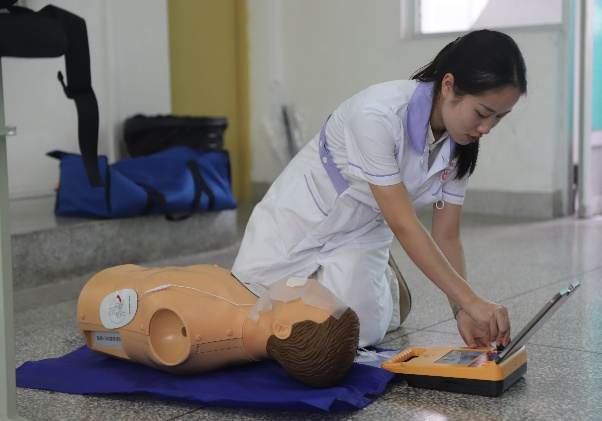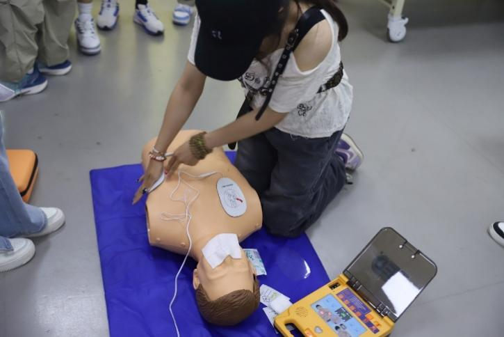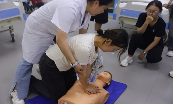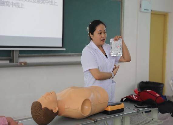 培训现场,王紫衣、吴小优老师采用“理论讲解+实操演练”相结合的方式,生动地为同学们介绍心肺复苏(CPR)“黄金4分钟”救援理念、自动体外除颤器(AED)的正确操作方法和气道异物梗阻时海姆立克急救法等应急处置要领。医生强调,在专业救援人员到达前,“第一目击者”迅速、科学的现场反应,是挽救生命、降低伤害的关键。
